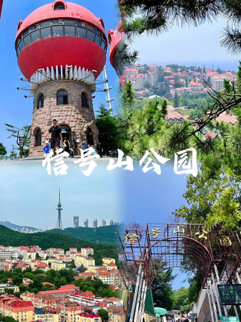 ▲ 信號山公園位於青島市中心,因曾在山頂建有為船隻引航的信號台而得名。信號山海拔98米,山頂三幢紅頂蘑菇樓格外引人注目,其中較高的一座是旋轉觀景樓,在這裡你可以360度俯瞰青島“紅瓦綠樹,碧海藍天。 進去設施大門,先不急到高處旋轉觀景樓。南坡上有踏浪觀景台,就在連心橋下面,是拍攝南邊德國古堡式建築迎賓館的好位置。連心橋上一把把紅色愛心鎖掛在綠色欄桿上,情侶們可以在此買一把連心鎖把彼此的山盟海誓鎖在信號山上,據說與朋友、友人、或者家人手拉手走過連心橋可以得到幸福。 再往前,可以看到五龍潭噴泉等景觀
