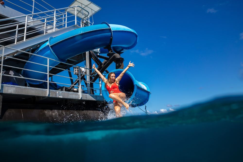 ▲ 您可以從我們的浮潛平台躍入清澈見底的海水中,或者選擇乘坐我們的半潛艇和玻璃底船進行探索之旅,保持身體乾爽。 走進我們的水下觀測站,五彩繽紛的魚群游弋而過,我們的海洋團隊還會為您帶來輕鬆愉快的餵魚表演。 家庭和年輕的客人可以在封閉式海水泳池中盡情玩耍,或體驗Sunlover 30米螺旋滑水道的刺激,緩緩滑入熱帶海洋。訓練有素的救生員在高處值守,兩個浮潛平台均設有安全便捷的下水樓梯。 卡利普索礁影像公司全天都在船上,捕捉水面上下精彩瞬間。照片會在您返回開恩茲之前準備就緒——直接發送到您的手機,讓