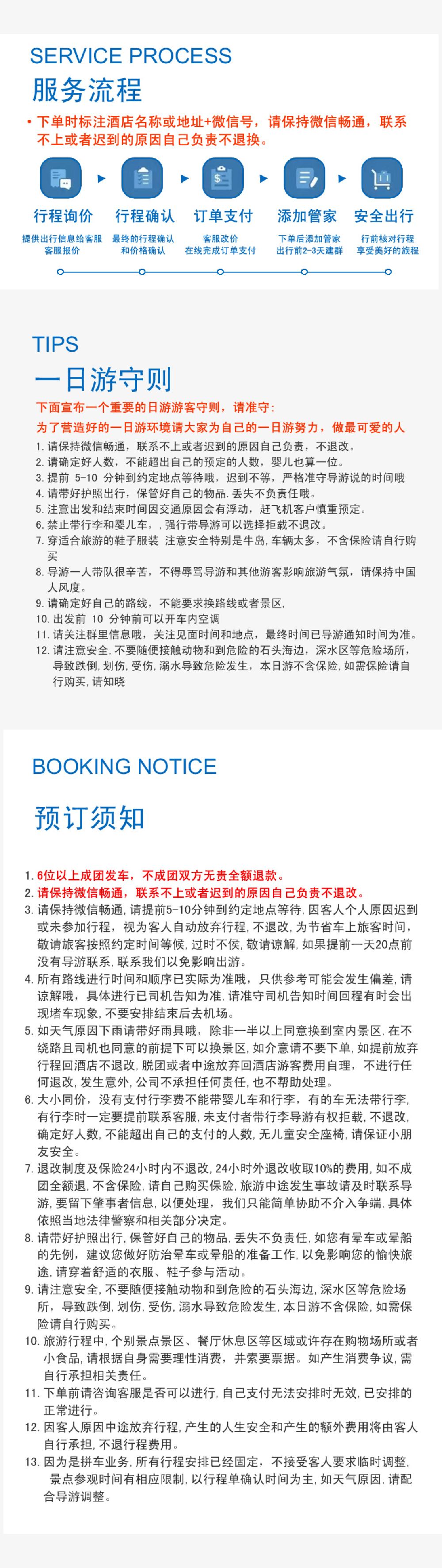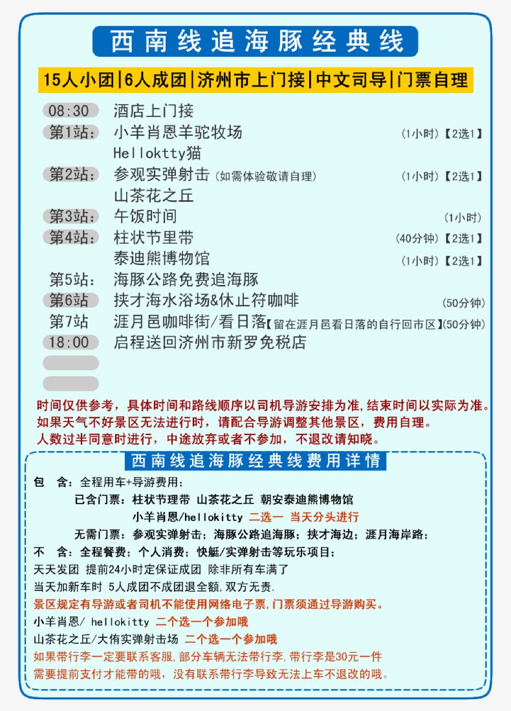 由於座位有限,安排妥當後將不再接受其他客人,因此因個人原因遲到或未能參加行程,將視為自動放棄,恕不接受以此為由要求取消或退款,敬請理解!