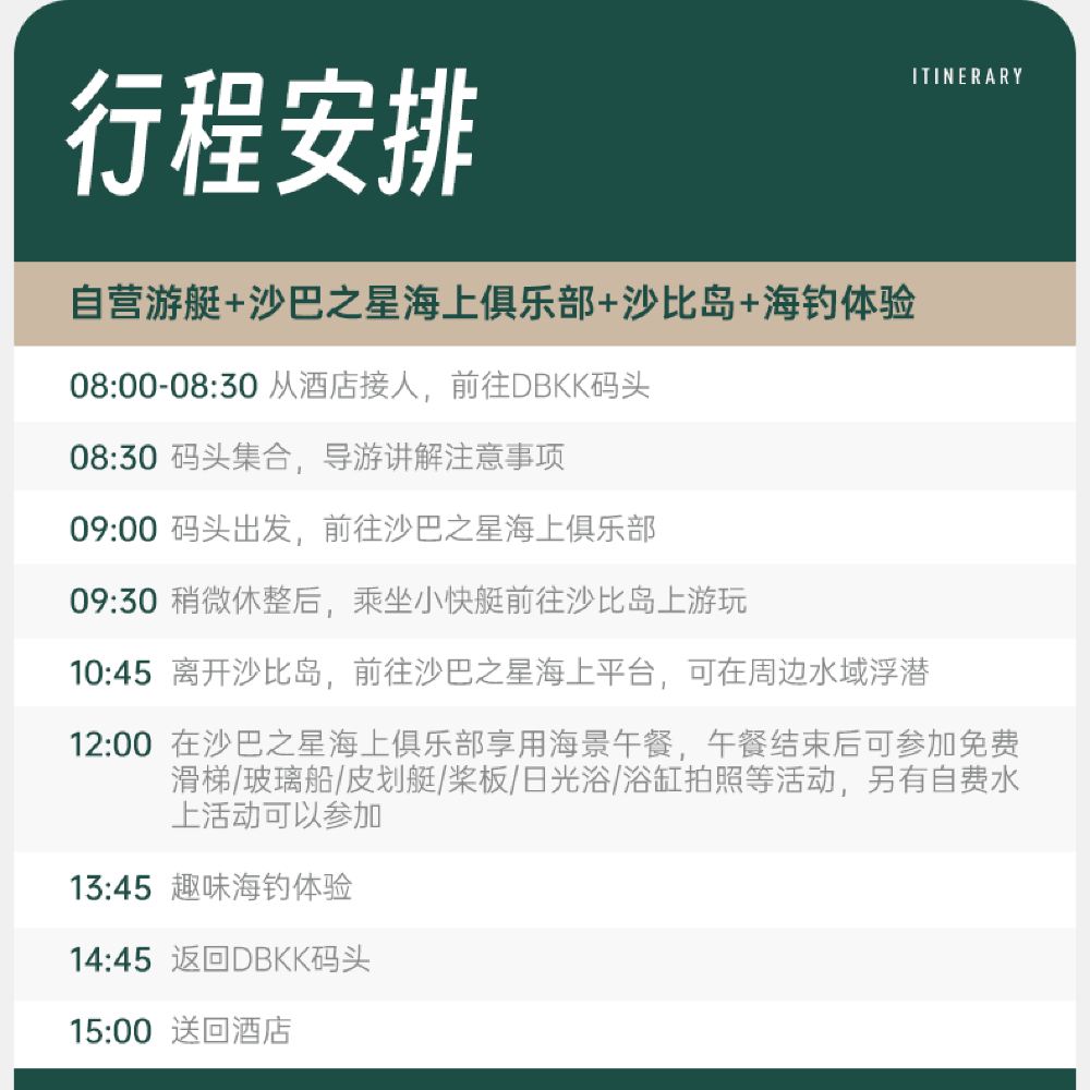 於指定地點接載08:00 亞庇 於指定地點接載 酒店不同,接人時間不同,具體接人時間請看確認函。市區酒店免費接送,郊區酒店:1 borneo/Inanam/putatan區域以及rasa ria/Nexus酒店需補差90元/人