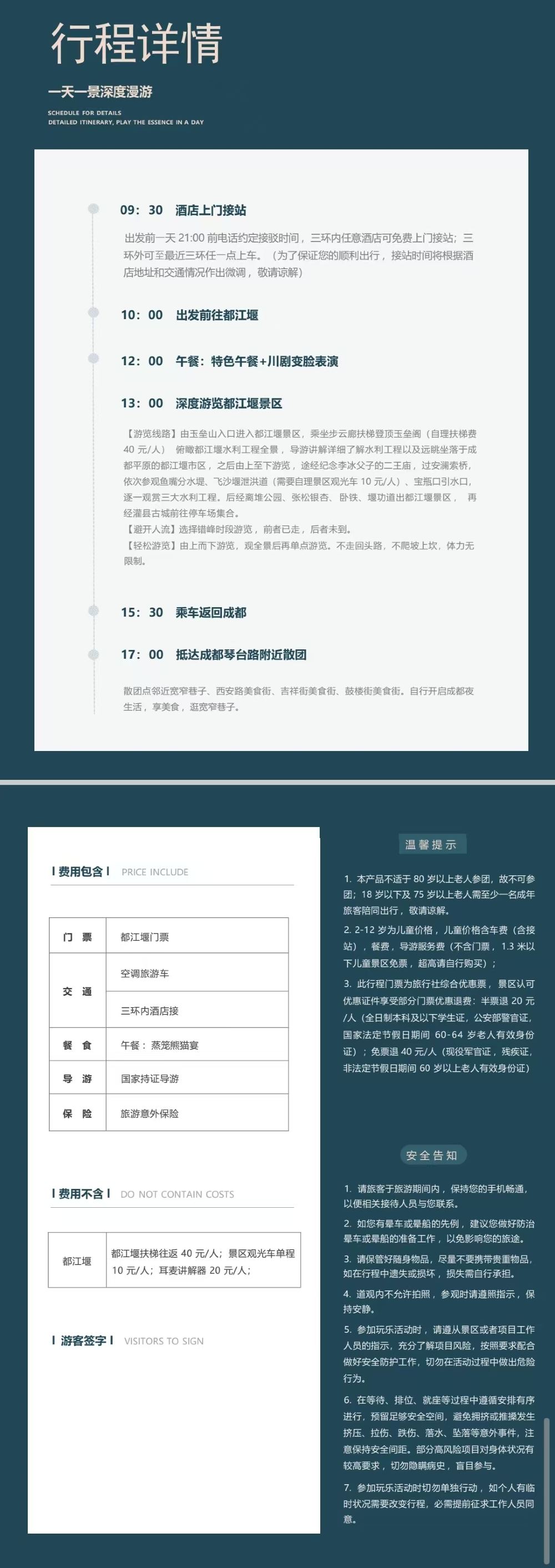 13:00出發:不含午餐,無川劇表演 出發前一天 21:00 前電話約定接駁時間,三環內任意酒店可免費上門接站;三環外可至最近三環任一點上車。(為保證您的順利出行,接站時間將根據酒店地址和交通情況作出微調,敬請諒解) 景區自費:70元/人 (耳麥講解器20元/人,玉壘閣扶梯40元/人,都江堰景區內電瓶車10元)交通
