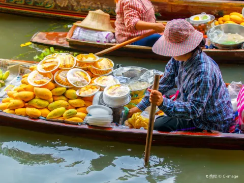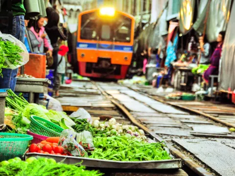 Mae Klong火車鐵路市場+Damnoen Saduak水上市場 Mae Klong火車鐵路市場:一睹攤販們在短時間收拾攤檔奇觀及體驗與火車擦身而過的驚險情景。