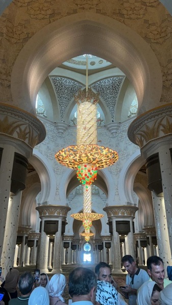 • 參觀阿布達比大清真寺,用意大利大理石建成,其82座圓頂均鑲上24K金,寺內的1,200條大理石柱的花紋全以人手逐粒把珍貴配件鑲嵌而成,還有全球最大的水晶吊燈,