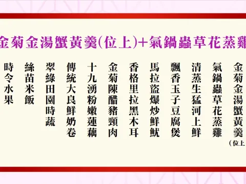 品嚐【金菊金湯蟹黃羹(位上)+氣鍋蟲草花蒸雞】【海鮮自助火鍋+鐵板燒自助餐】【明爐招牌果木脆皮燒鵝宴】