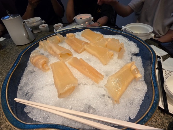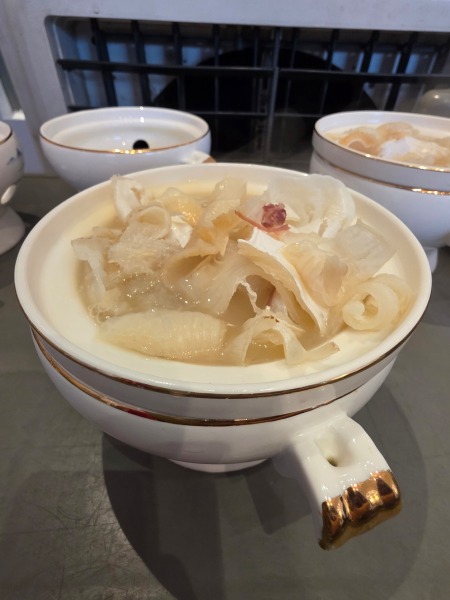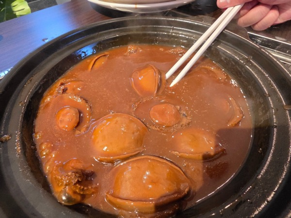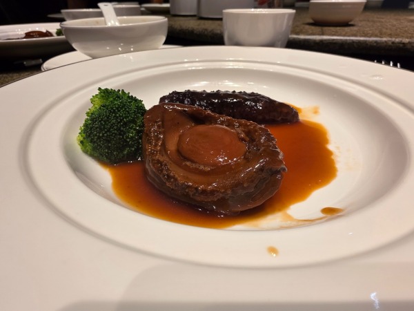 品嚐【鮑‧參‧翅‧肚.四重奏】必食推介:堂做濃湯雞煲魚翅(位上)(現場秤足份量,保證每人4両牙揀翅)、堂做鮑汁糖芯大連四頭鮑+大連遼參(位上)、冰鎮金龍大花膠