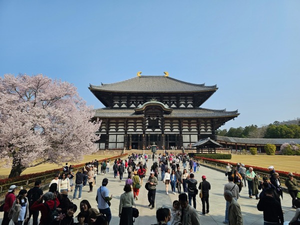 • 東大寺~建有全日本最大的古銅大佛,而佛殿更是全世界最大的木造建築物;隔著大佛池遠望過去,大佛殿在樹叢間若隱若現。