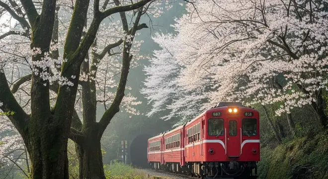 • 特色: 經典的「小火車穿過櫻花林」畫面就在這裡!主要品種是潔白的「染井吉野櫻」。除了賞花,還能看日出、雲海、神木。