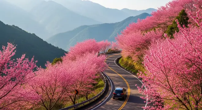 • 特色: 獨有的「紅粉佳人」品種,花瓣呈現粉嫩的粉紅色,帶有淡淡香氣。長達3公里的櫻花隧道,美得像置身日本。注意:櫻花季期間實施嚴格交通管制。