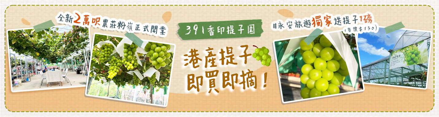 新農莊報到😍位於粉嶺【391香印提子園】以港產優質香印提子作招徠,佔地2萬呎,自6月下旬「試業」已在各大親子群組打響名堂。今次永安旅遊與其獨家合作,報指定本地團👉🏻【391香印提子園+潮州鹵漢120分鐘放題】,跟住我哋☀️即摘即送香印提子1磅(原售價:$130)。粒粒鮮甜多汁,圓潤通透,甜度高達16+,保證讓你一食欲罷不能。即睇內文了解更多!| 撰文:Nathaniel、Banner圖:Agnes Lui